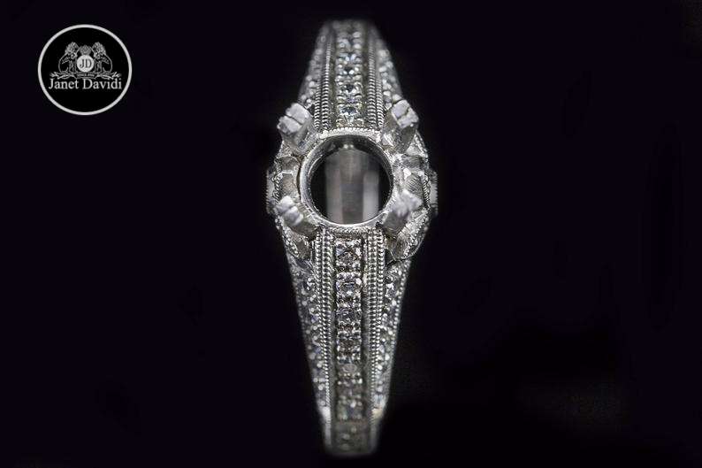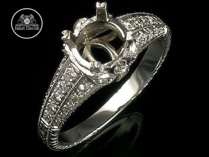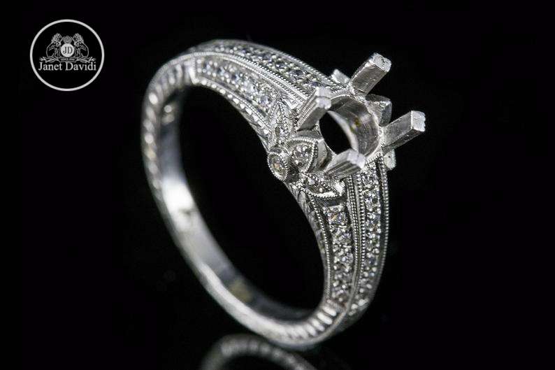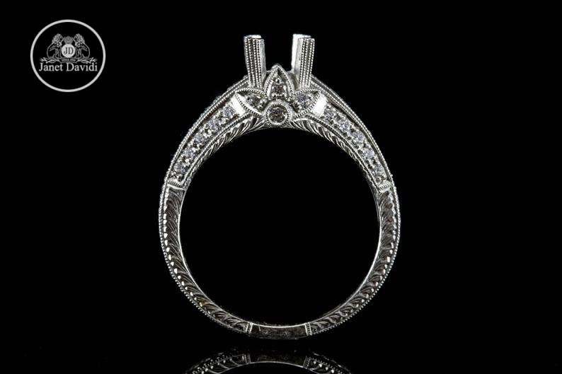 Edwardian Style Engagement Ring, Natural Diamond Engagement Ring,Millgrain and Engraved Engagement Ring, Semi Mount Setting Only, Custom