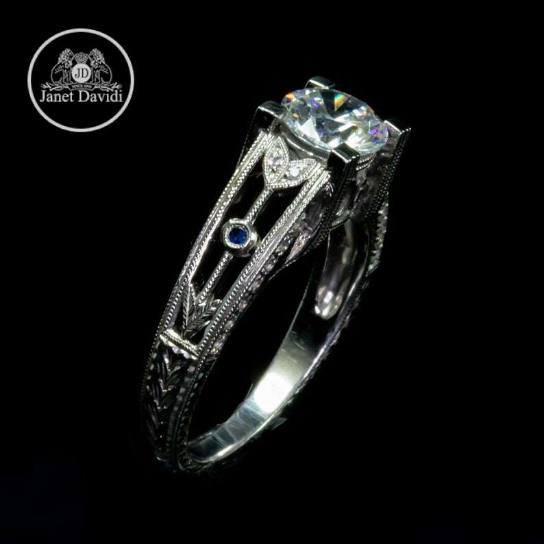White Gold Blue Sapphire and Diamond Mill Grained-ENGAGEMENT RINGS