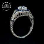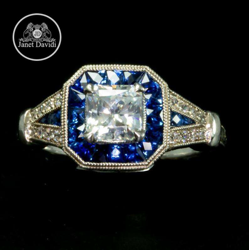 Our architectural, Art Deco-inspired Octagon shape semi mount empathizes the center stone with a pool of genuine blue sapphires surrounding it. The detail work along the shank is a reflection of our traditional handcrafted style. Your bride’s eyes will light with delight at this unique ring. Includes 0.10 carats of VS2-SI1, G-H color diamonds and 0.91 ct of custom cut genuine blue sapphire. Metal details include mill grained and engraving, Very nice mill grain work around the setting. Available for an Asher Cut, Princess or Round Center Stone, Please contact us for pricing.