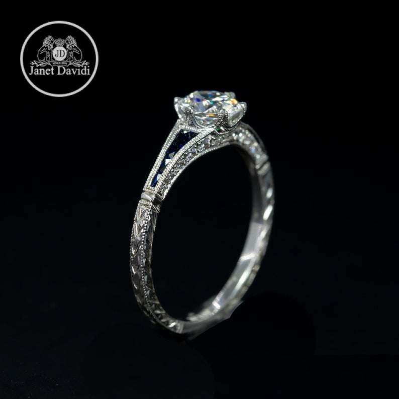 Our architectural, Edwardian-inspired semi mount has a splash of genuine blue sapphire to give this traditional ring a modern touch. Like all of our jewelry, the detailed engravings around the band are hand crafted.
