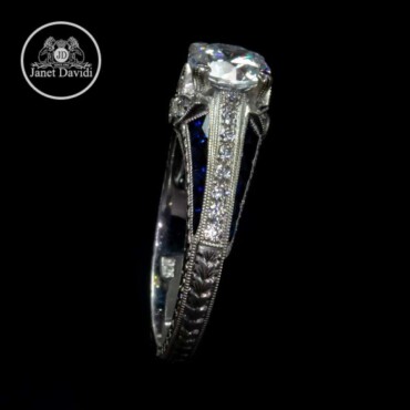 Our architectural, Edwardian-inspired semi mount includes princess-cut, channel-set genuine blue sapphires. The side profile of this ring features a three-petal diamond flower. As the years pass she’ll be reminded of her wedding bouquet each time she looks at her hand. A matching band is available and can be ordered separately.